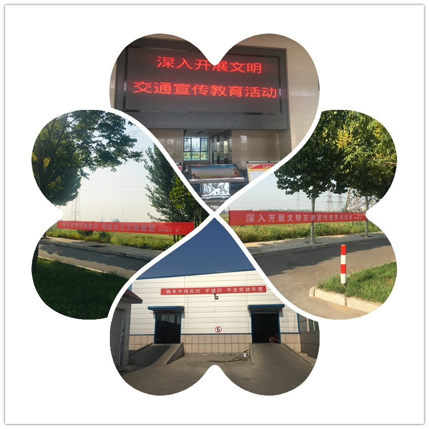 懸掛文明交通宣傳標語,營造濃厚的宣傳氛圍。公司在廠區門口對面及存車棚外等懸掛文明交通宣傳教育標語,使員工在上下班路上抬頭就可以看到醒目的標語,特別是在存車棚處時刻提醒員工“騎車不闖紅燈、不逆行、不走機動車道”。通過懸掛標語,營造了濃厚的文明交通宣傳教育氛圍。