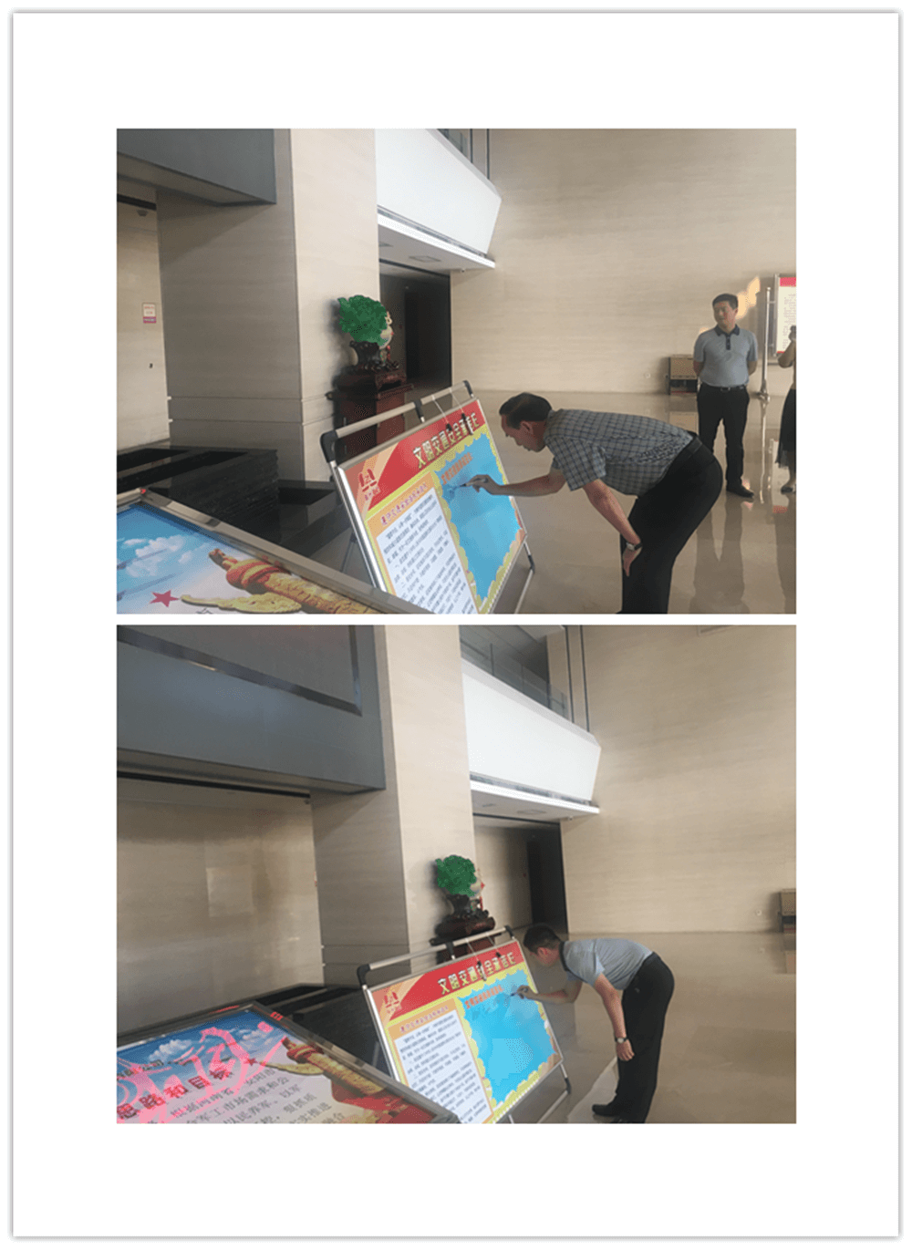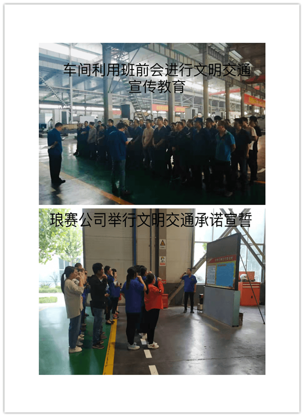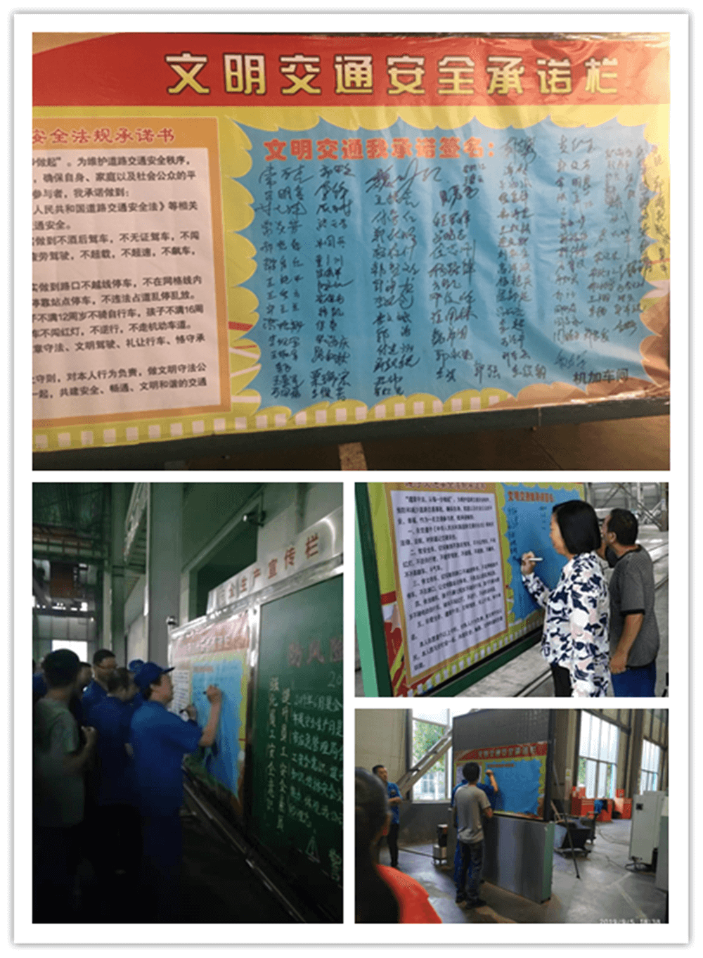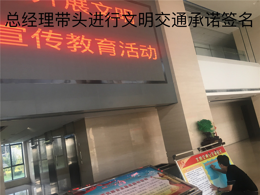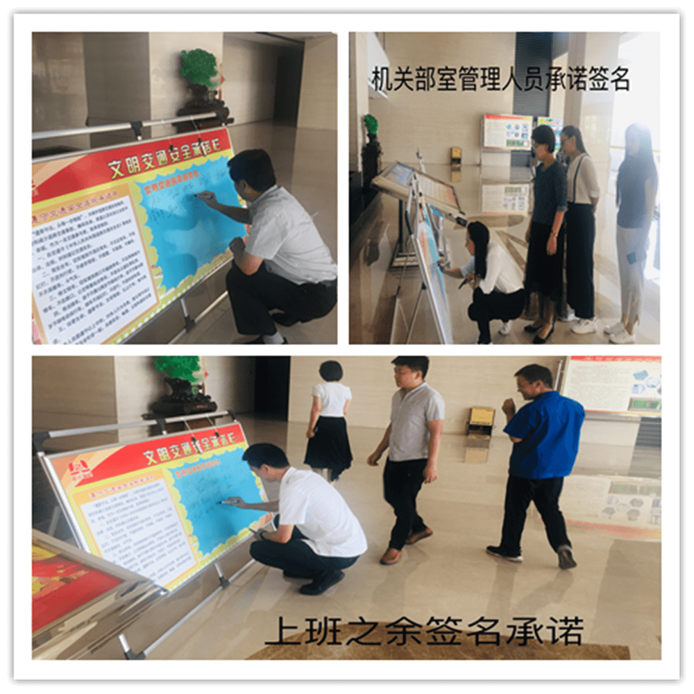 簽訂“遵守交通安全法規承諾書”。公司制作了“遵守交通安全法規承諾欄”版面十余塊,擺放在醒目位置,以部門為單位,每位員工在版面上進行簽名承諾。公司總經理郭釧帶頭在《文明交通承諾欄》上簽名,其他領導和部門員工也陸續進行了簽名,通過交通安全承諾簽名,使每位員工時刻提醒自己,履行自己承諾。